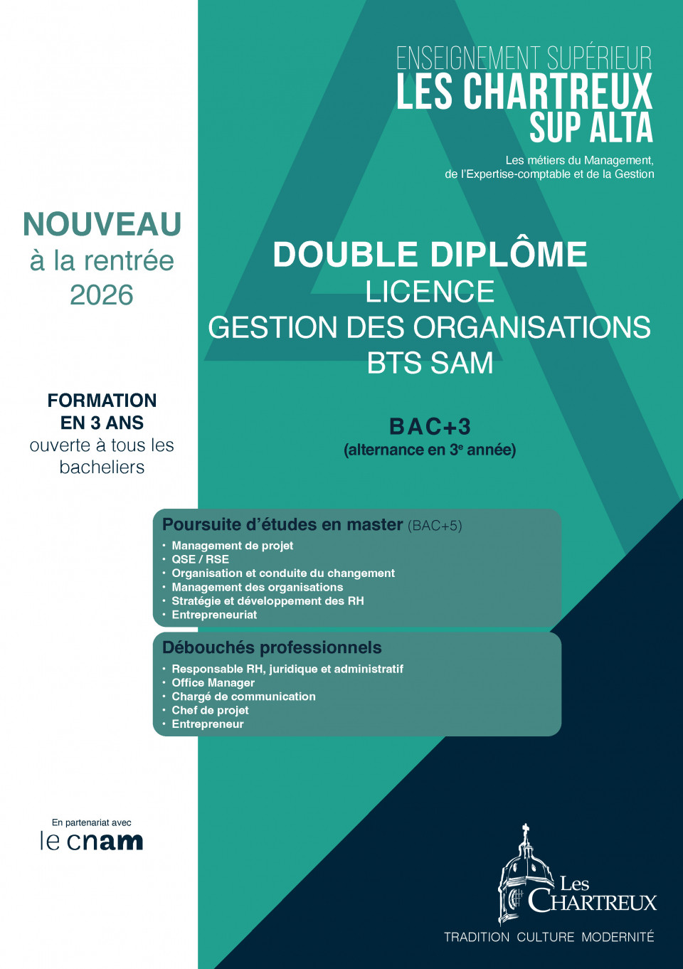 En partenariat avec le CNAM (Conservatoire national des arts et métiers), l'Institution des Chartreux ouvre à la rentrée 2026 la licence de gestion des organisations - BTS SAM, Bac+3 .Le grade de licence est obtenu à la fin des trois années d'études, elles-mêmes sécurisées par l'obtention, à Bac+2, du BTS Support à l'action managériale.PLUS D'INFOS
